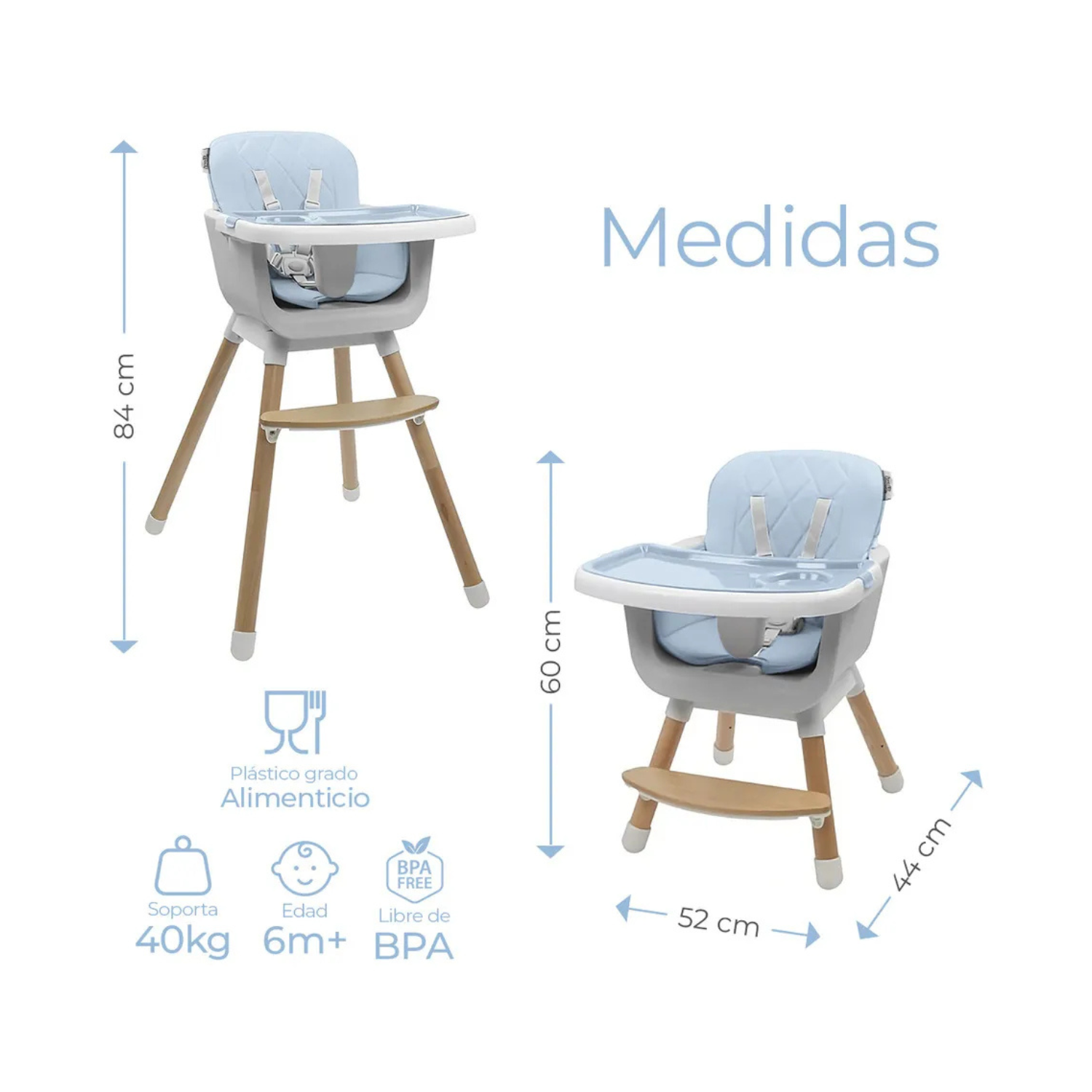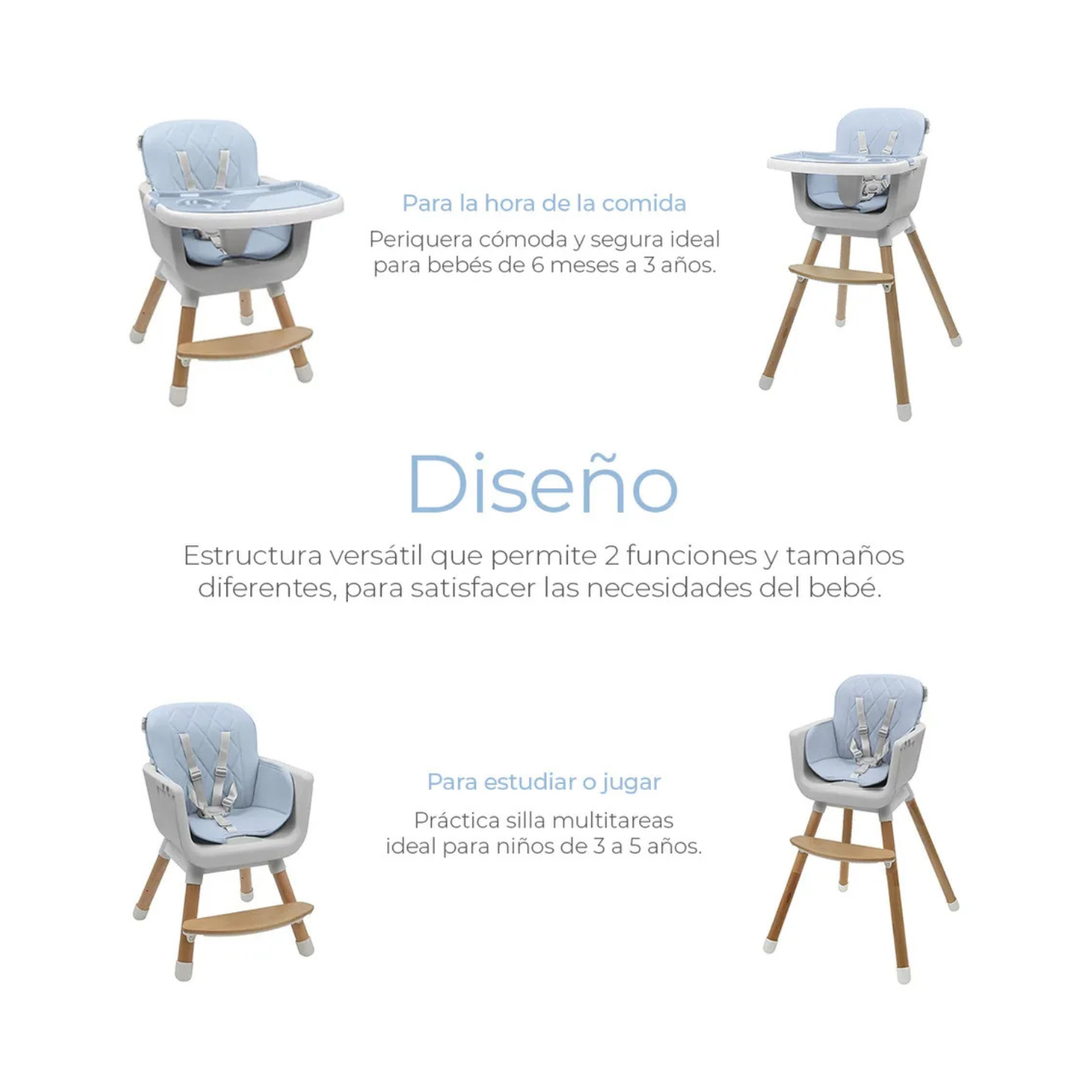 Diseño moderno con altura ajustable y charola desmontable. Ideal para la hora de la comida, el juego o incluso como una silla con estilo para colorear o relajarse.
