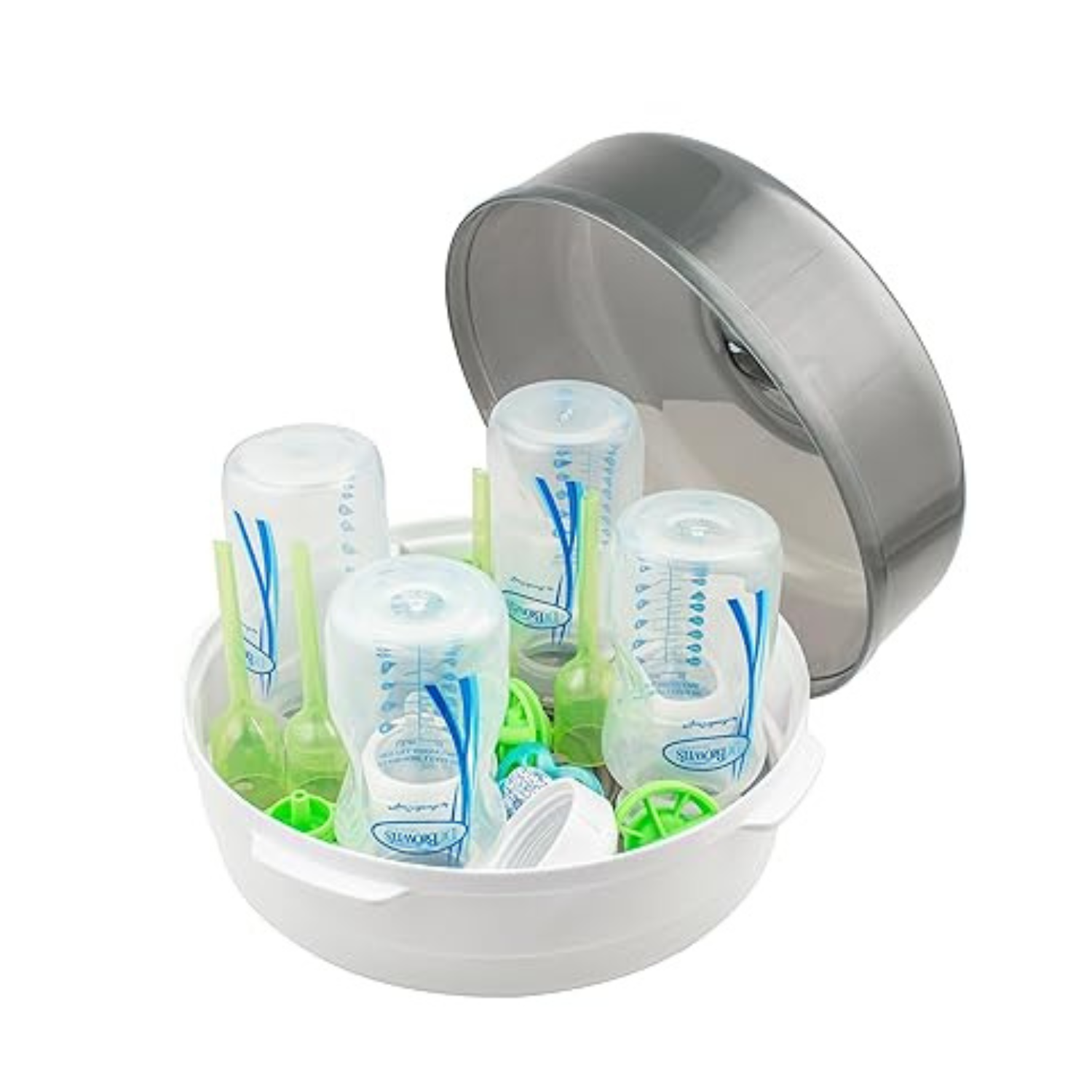 Rápido, simple y eficaz. Solo agrega agua y colócalo en el microondas para esterilizar biberones, chupetes y otros objetos pequeños—sin complicaciones ni químicos.