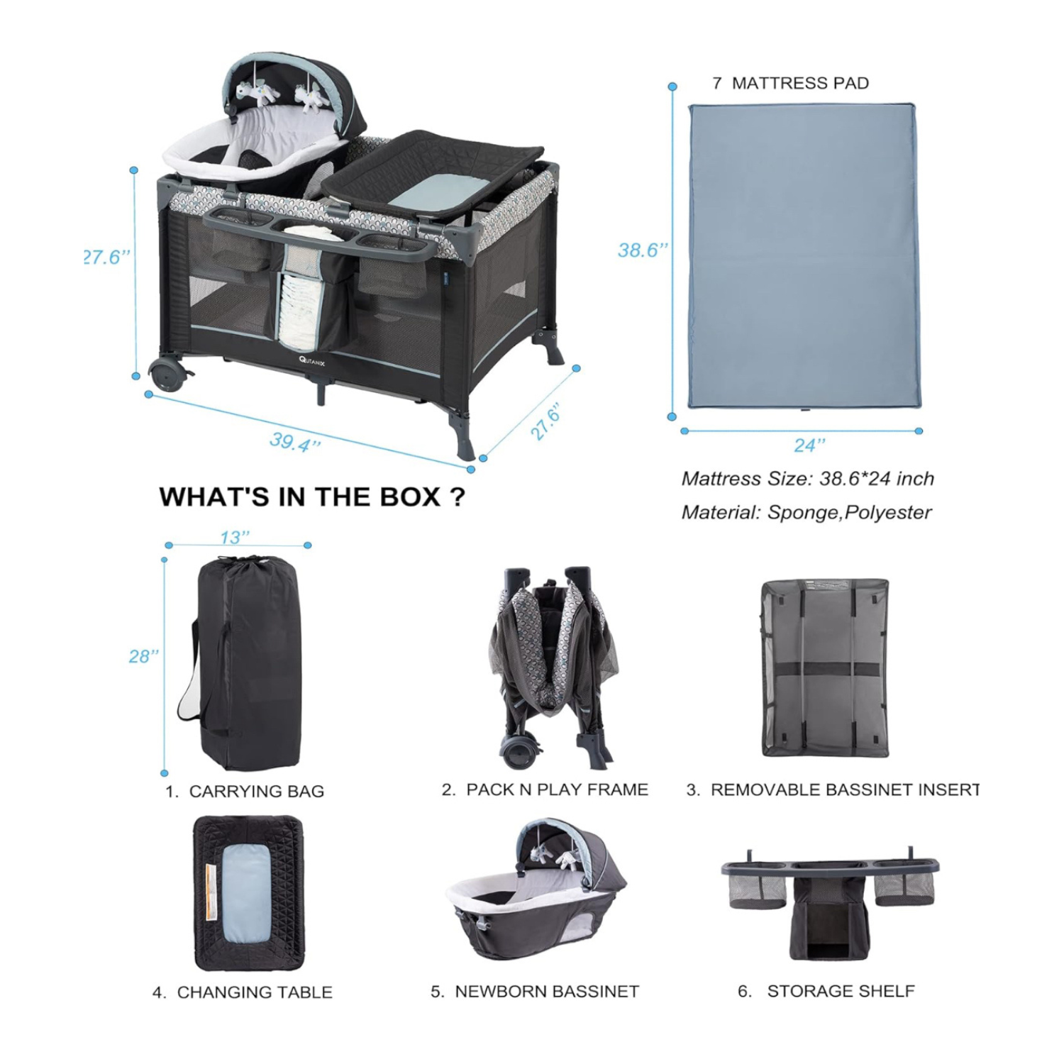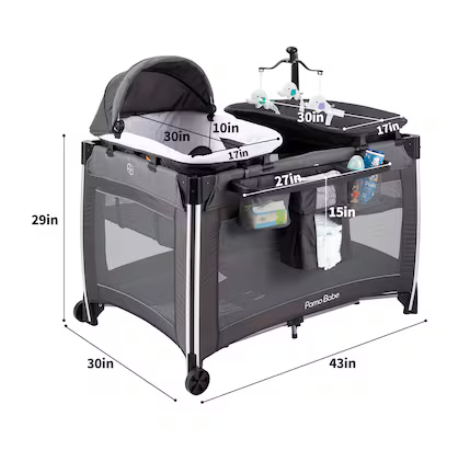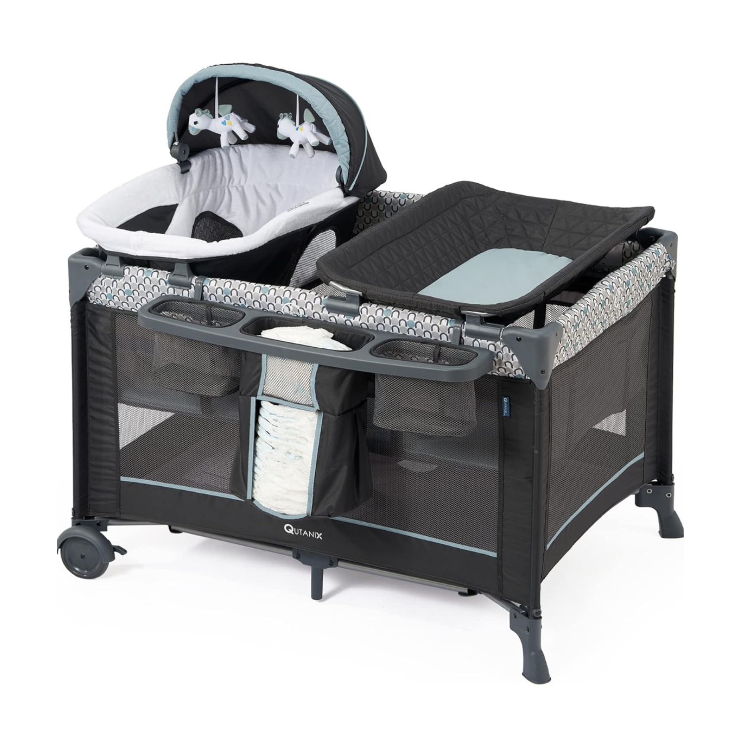 Este corral todo en uno incluye moisés, cambiador, dosel con juguetes y organizador de almacenamiento—ideal para dormir, cambiar pañales y facilitar la rutina.